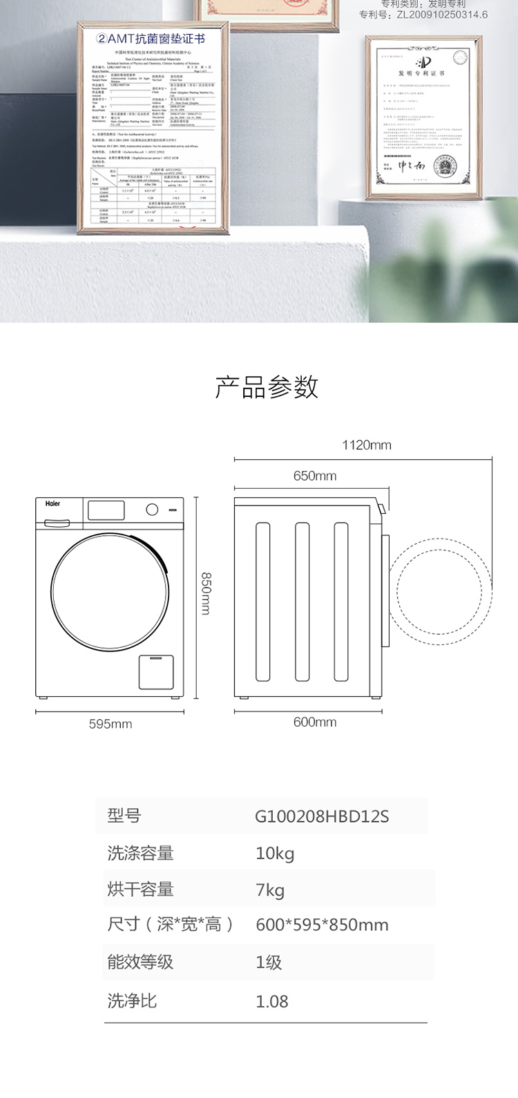 商品名称: 海尔 10KG 滚筒洗衣机全自动洗烘一体机 变频一级能效智能投放巴氏杀菌(单位:台)