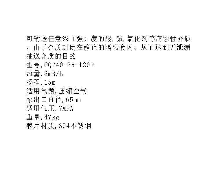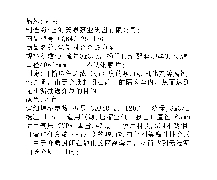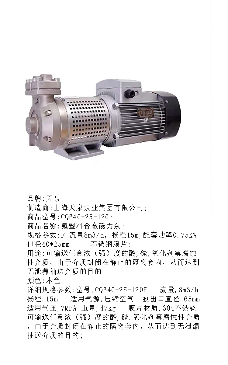 商品名称: 天泉 CQB40-25-120 F 流量8m3/h,扬程15m,配套功率0.75KW 口径40*25mm 不锈钢膜片 氟塑料合金磁力泵 本色(单位:台)
