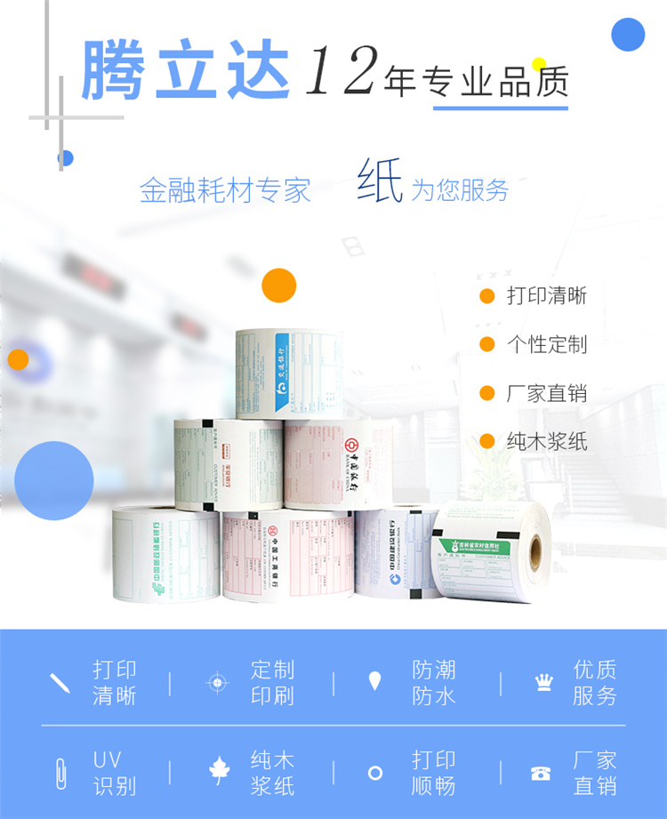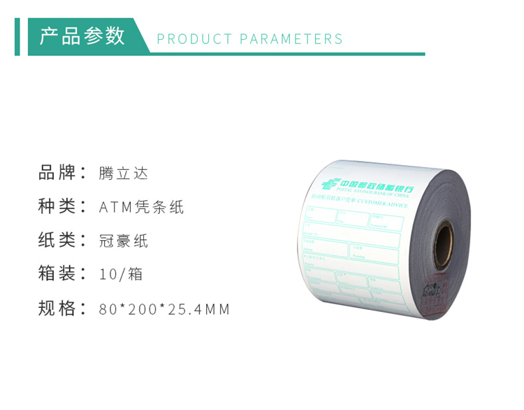 • 商品名称:腾立达 ATM机客户回单 打印纸银行专用凭条纸 热敏纸 80*200*25.4mm 10卷/箱 白色(单位:箱)