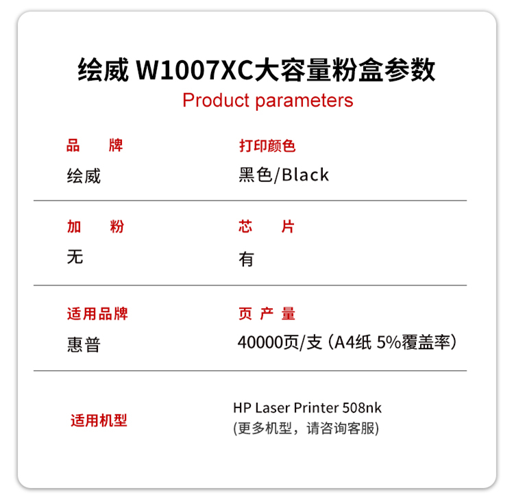 • 商品名称:绘威 W1007XC 大容量粉盒 适用惠普HP Laser Printer 508nk打印机墨盒 墨粉盒 碳粉盒 黑色(单位:支)