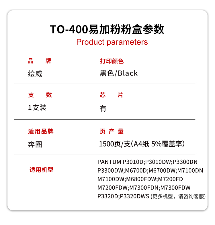 商品名称: 绘威 TO-400 易加粉粉盒 适用奔图PANTUM P3010 P3300 M6700 M6800 M7100 M7200 M7300系列打印机硒鼓 墨盒 黑色(单位:支)