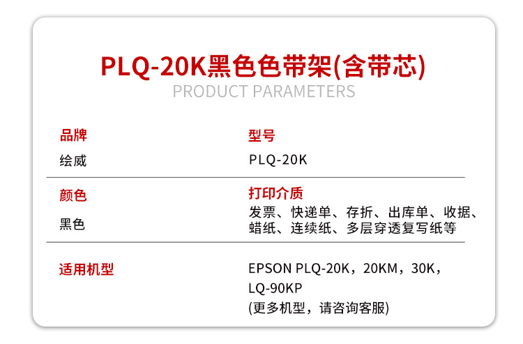 • 商品名称:绘威 适用EPSON爱普生PLQ-20K色带架 PLQ-20DM LQ90KP PLQ10K针式打印机PLQ-30K 30KM LQ-90KP(单位:个)