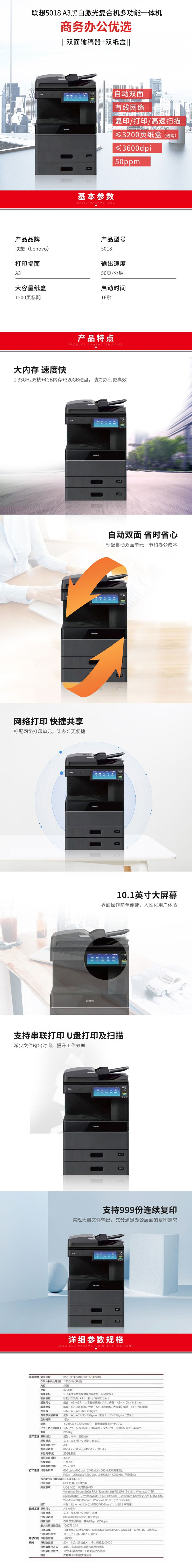 • 商品名称:联想(Lenovo) 5018 A3黑白激光复合机多功能一体机 标配(双面输稿器+双纸盒) 黑色(单位:台)