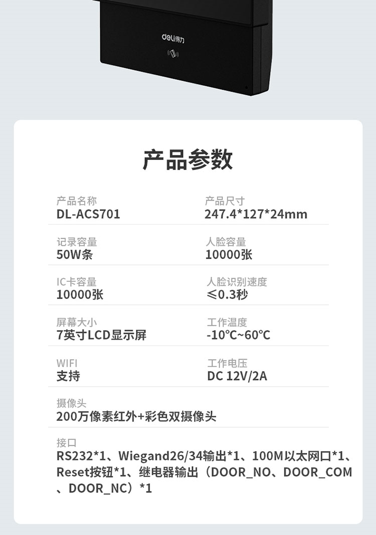 • 商品名称:得力/deli DL-ACS701 人脸考勤 门禁 刷卡机 单位:台
