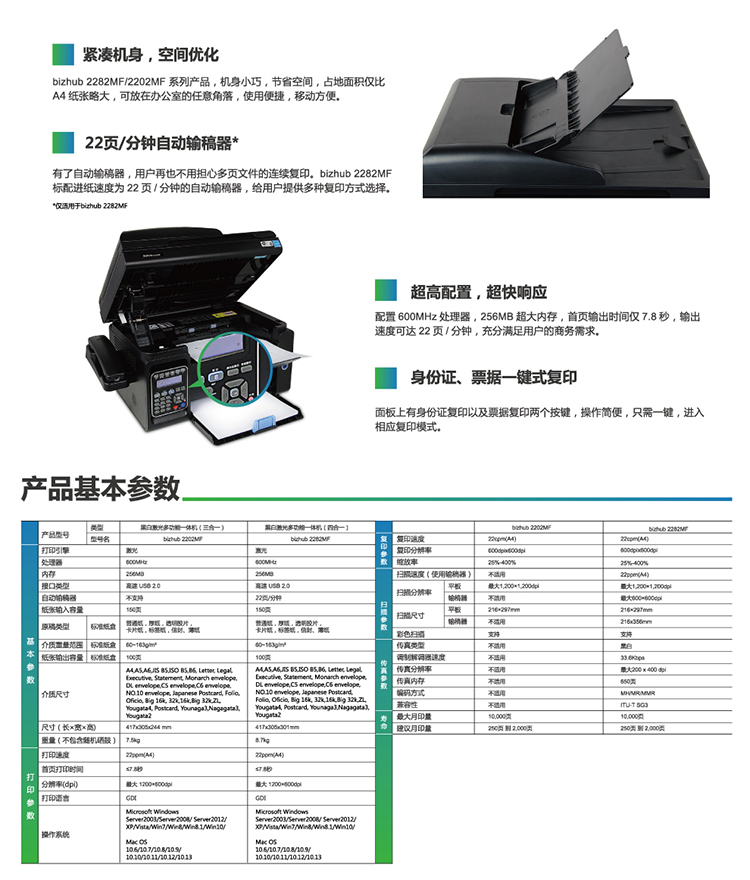 • 商品名称:柯尼卡美能达 bizhub 2202mf A4打印、三合一多功能一体机 打印机 黑色 (单位:台)