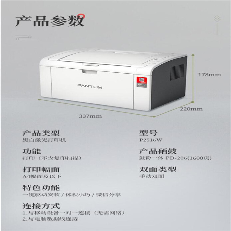 • 商品名称:奔图 PANTUM P2516 黑白激光打印机 A4幅面 计价单位:台