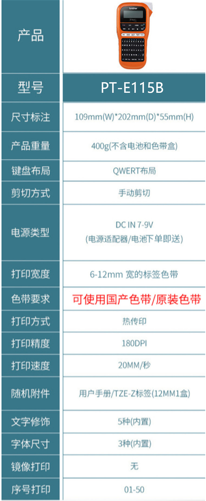 • 商品名称:兄弟 PT-E115B 标签打印机手持不干胶打签机便 标配 + 20卷色带 本色 (单位:套)