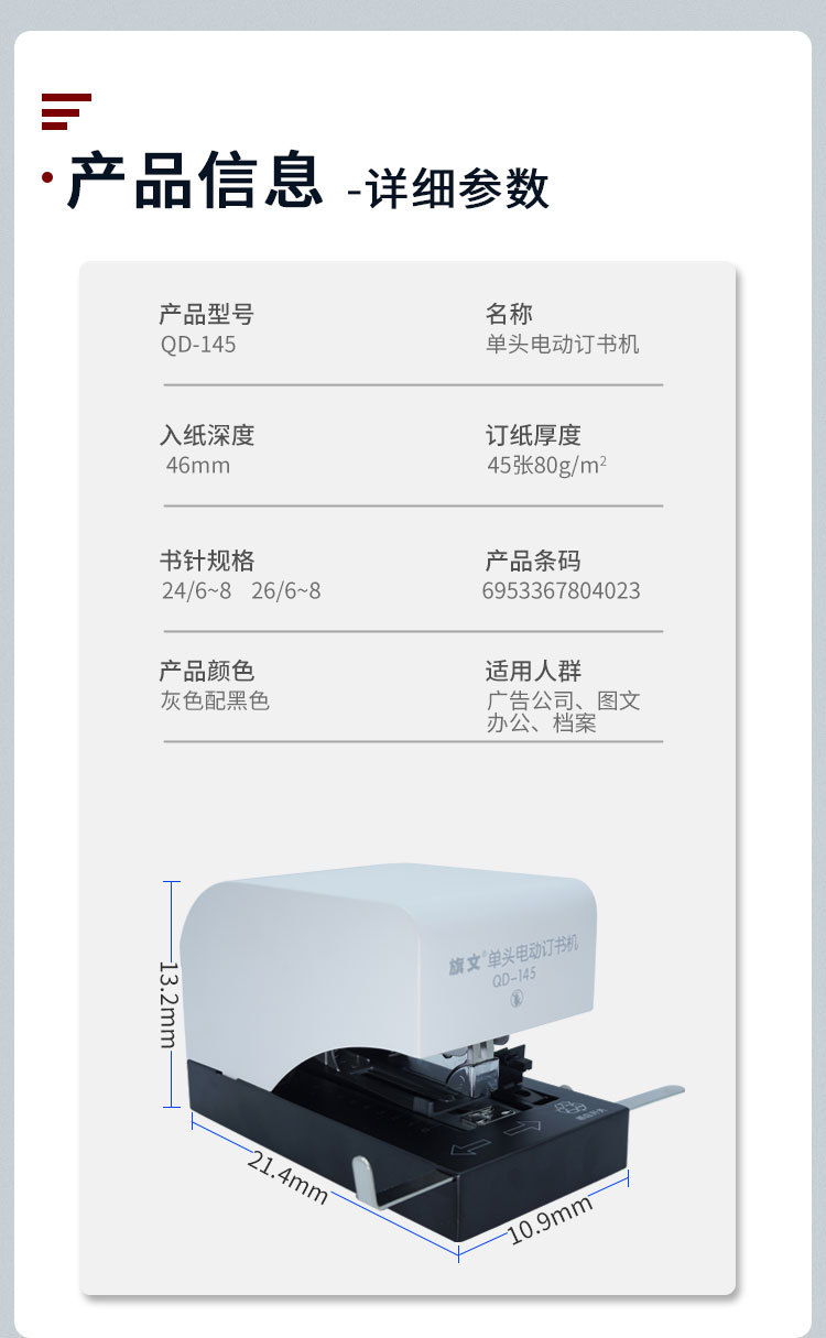 • 商品名称:旗文 QD-145 自动省力钉书机 白色 (单位:个)