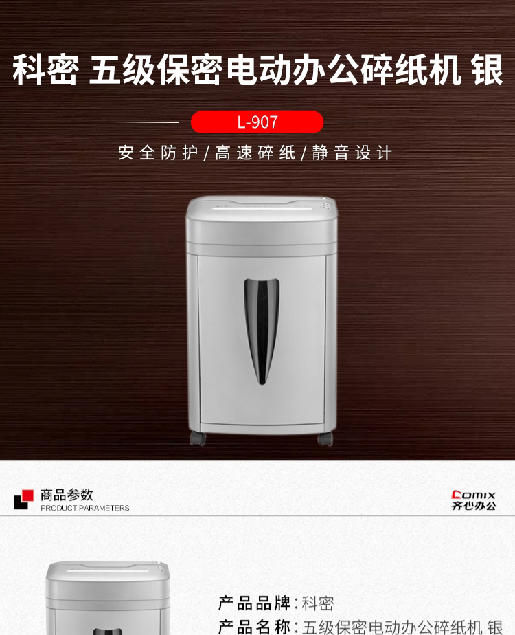 • 商品名称:科密 L-907 五级保密电动办公碎纸机 银(单位:台)