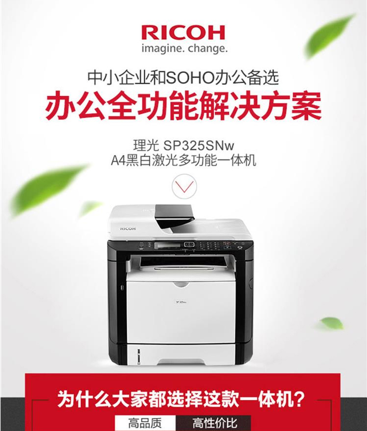 办公设备  > 打印/复印设备  > 激光打印机  >  理光  >  理光 SP 325SNw A4 黑白激光三合一 多功能一体机 灰白色