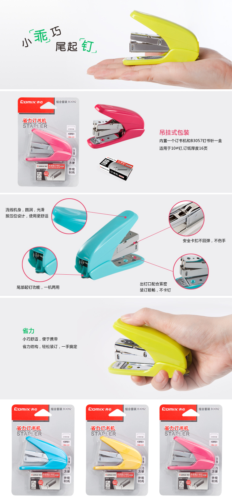 • 商品名称:齐心 B3092 省力订书机 便携式 10#配 (定制)