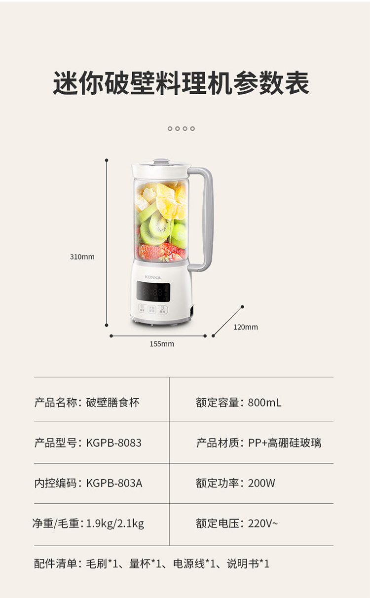• 商品名称:康佳 KGPB-803A 0.8L 多功能迷你料理机破壁机 本色(单位:个)