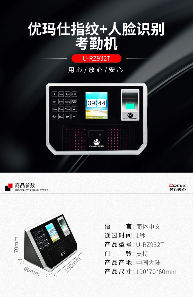 • 商品名称:优玛仕 U-RZ932T 指纹+人脸识别考勤机 配(单位:台)