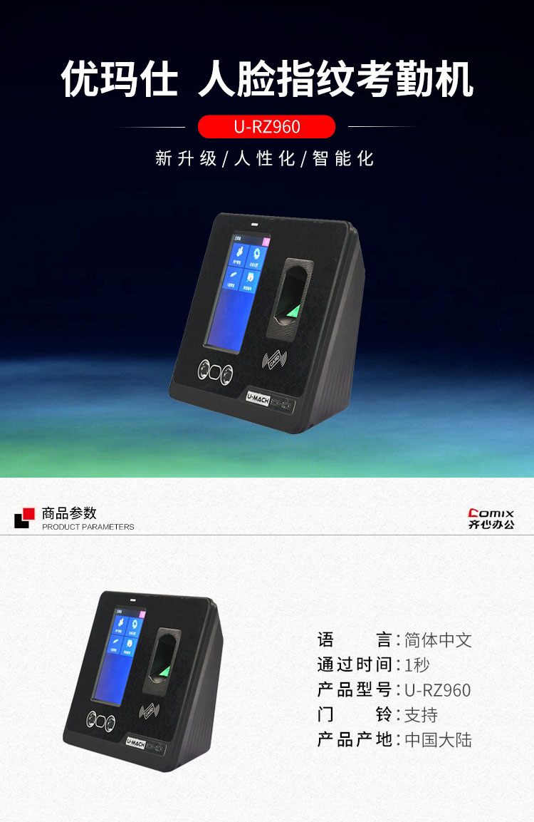 • 商品名称:优玛仕 U-RZ960 人脸指纹考勤机(带wifi) 配(单位:台)