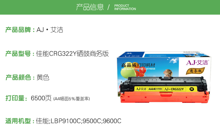 • 商品名称:艾洁(AJ) CRG322Y打印量6500页商务版适用于佳能LBP9100C9500C9600CCRG322打印机等硒鼓 硒鼓 (计价单位:只) 黄色