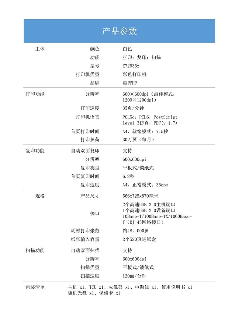 • 商品名称:惠普 LaserJet Managed Flow MFP E72535z 管理型数码复合机(单位:台)