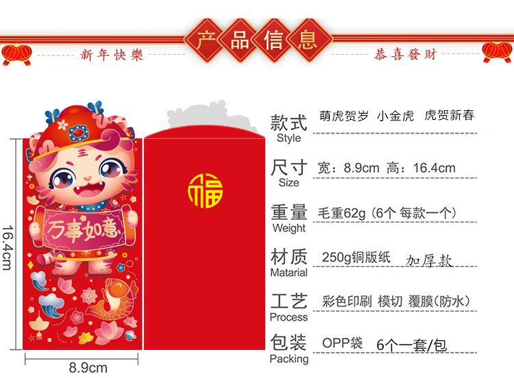 • 商品名称:耐辉顿 8.9*16.4cm 百元平放 虎年红包 红色(6个/包)(单位:包)