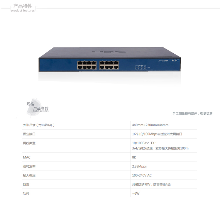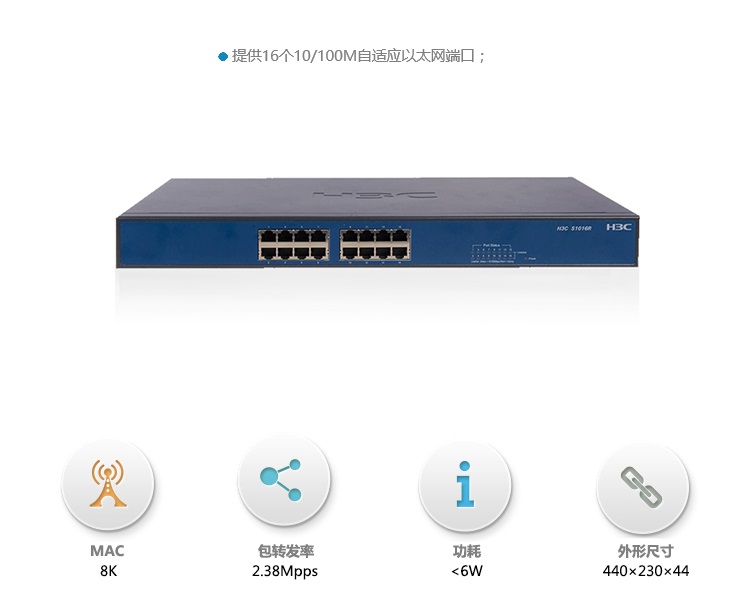 • 商品名称:华三 SOHO-S1016-CN 16口百兆交换机 单位:台