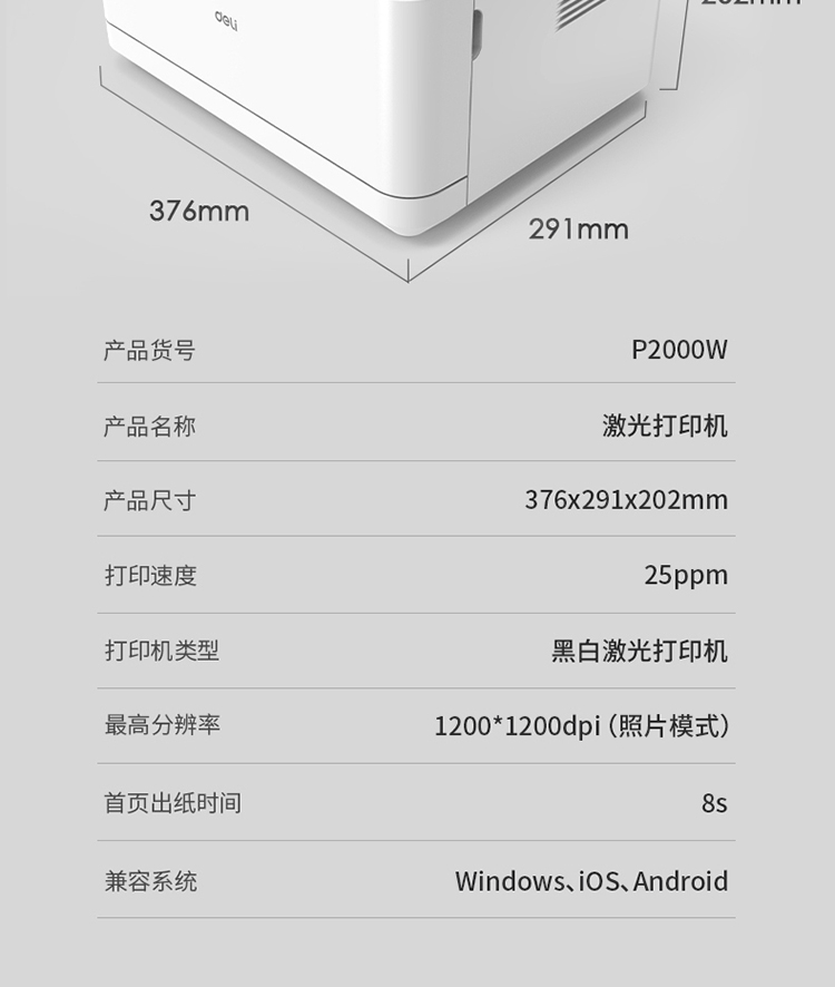 商品名称: 得力 deli P2000W 得力(deli) P2000W 黑白激光打印机 (计价单位:台) 白色 (单位:台)