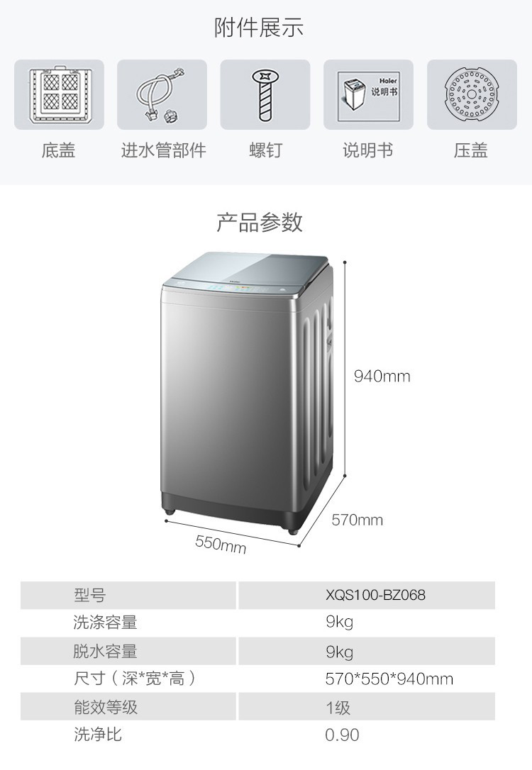 • 商品名称:海尔(Haier) XQS100-BZ068 波轮洗衣机 10公斤直驱变频全自动洗衣机 (单位:台) 灰色