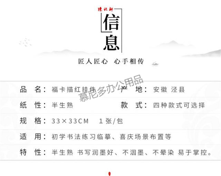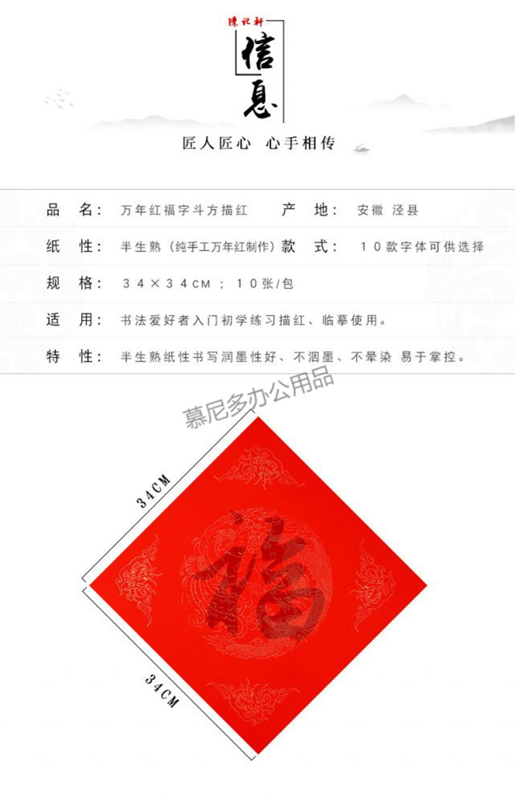 办公耗材  > 办公用纸  > 宣纸  >  迈爽  >  迈爽 20cm*20cm 小号行楷福字纸 10张/包 红色(单位:包)