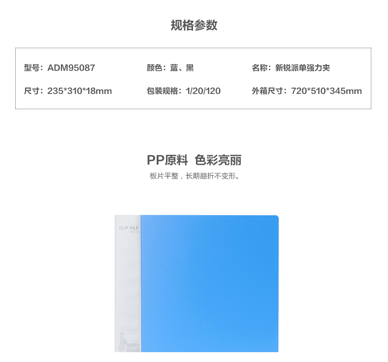 • 商品名称:晨光 ADM95087B 30页 办公用新锐派单强力资料夹 蓝色(单位:个)