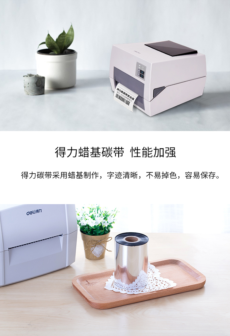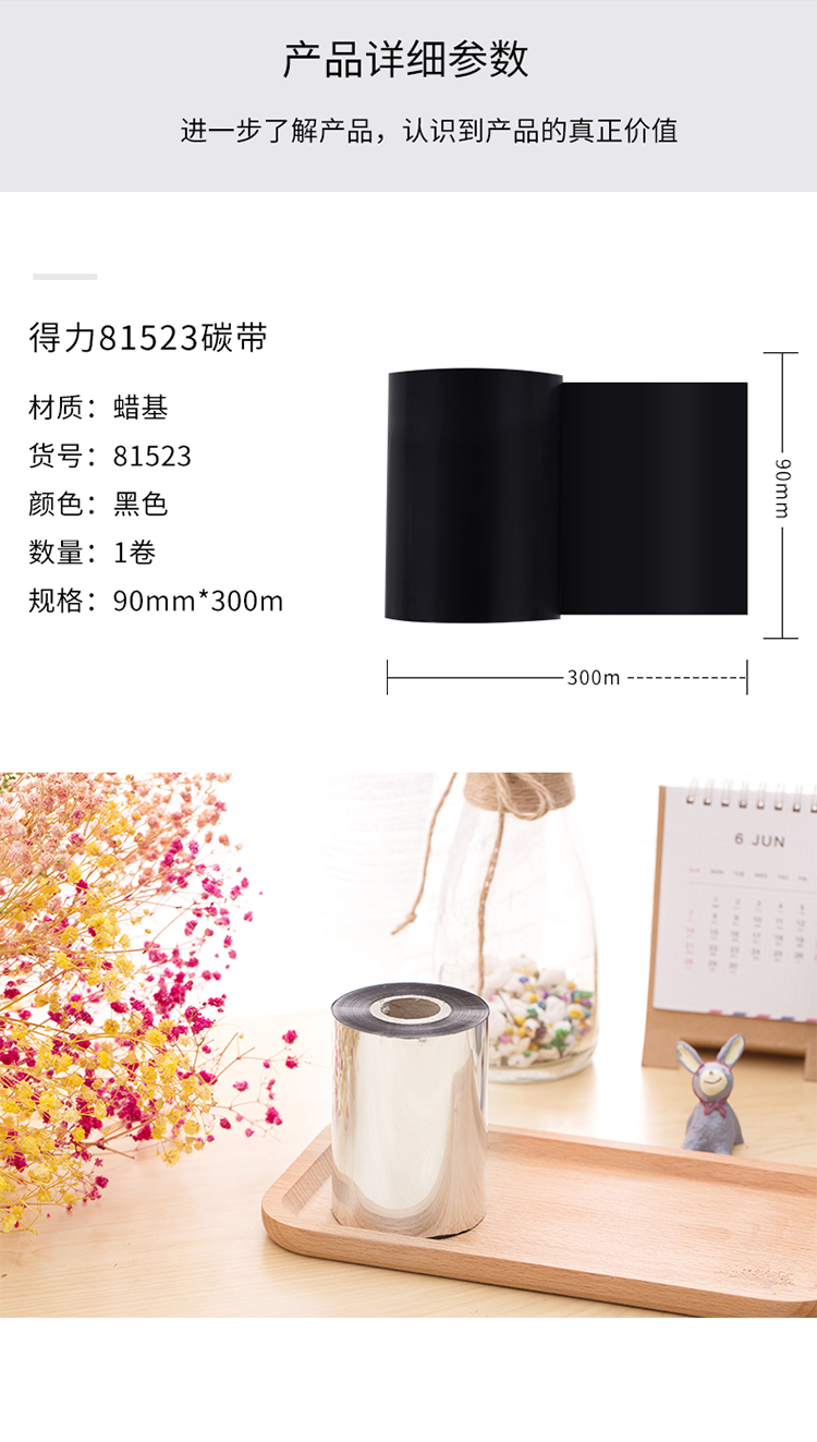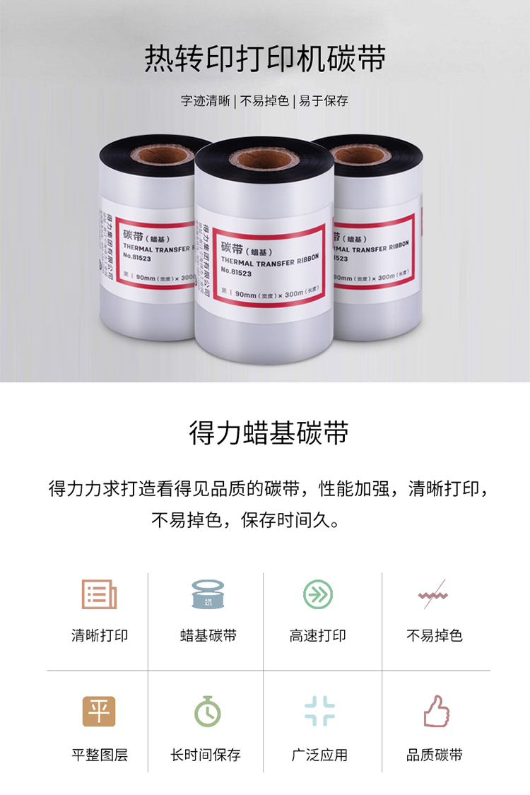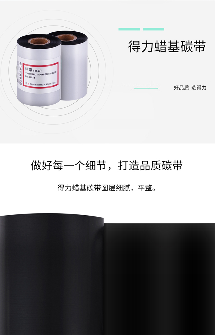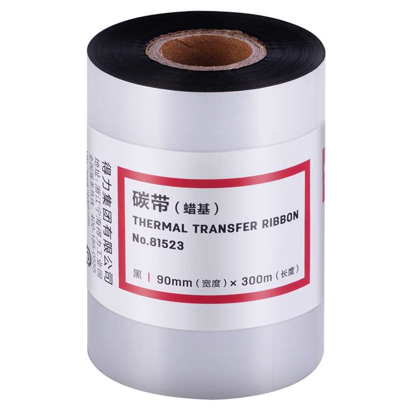 商品名称: 得力 81523 90*300mm 热转印条码机标签机通用型蜡基碳带 黑色(单位:卷)