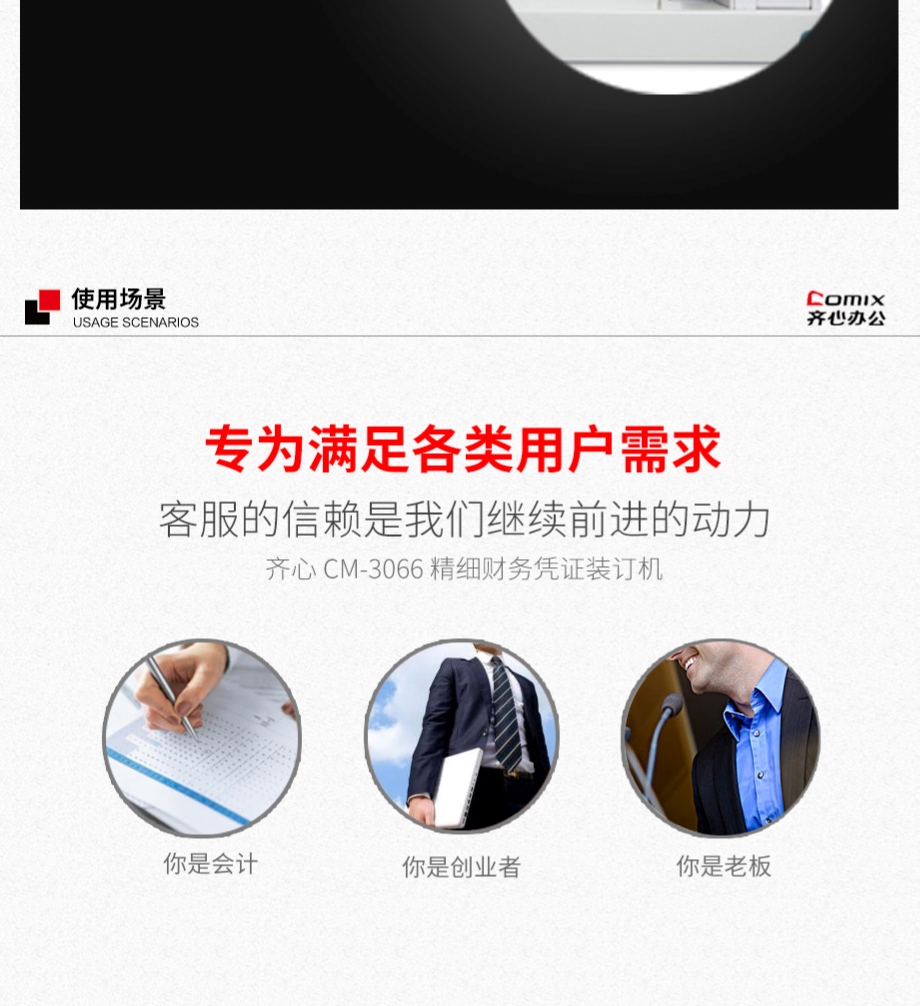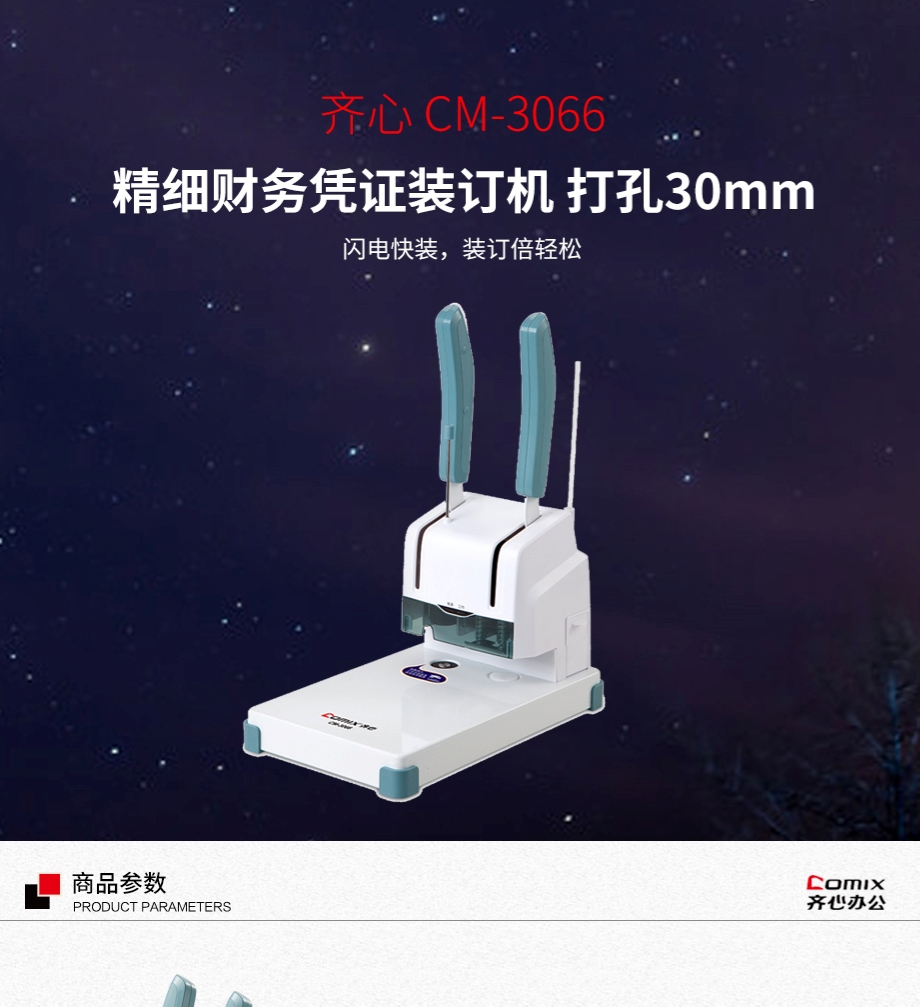 • 商品名称:齐心(COMIX) CM-3066 精细财务凭证装订机 打孔30mm 白(单位:台)