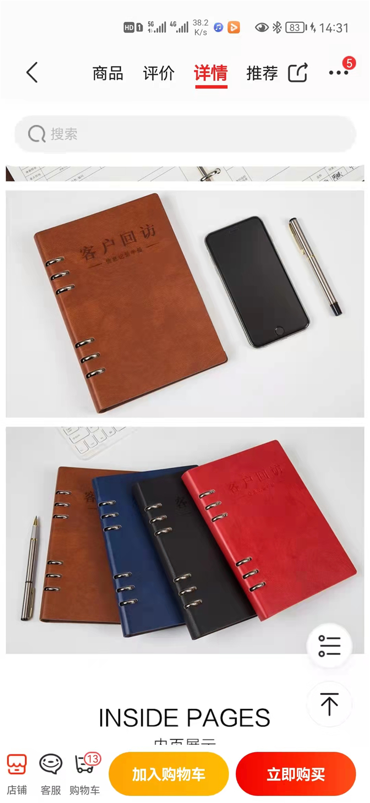 商品名称: 迈爽 B5皮壳活页夹装订客户回访笔记本 深蓝色(单位:本)