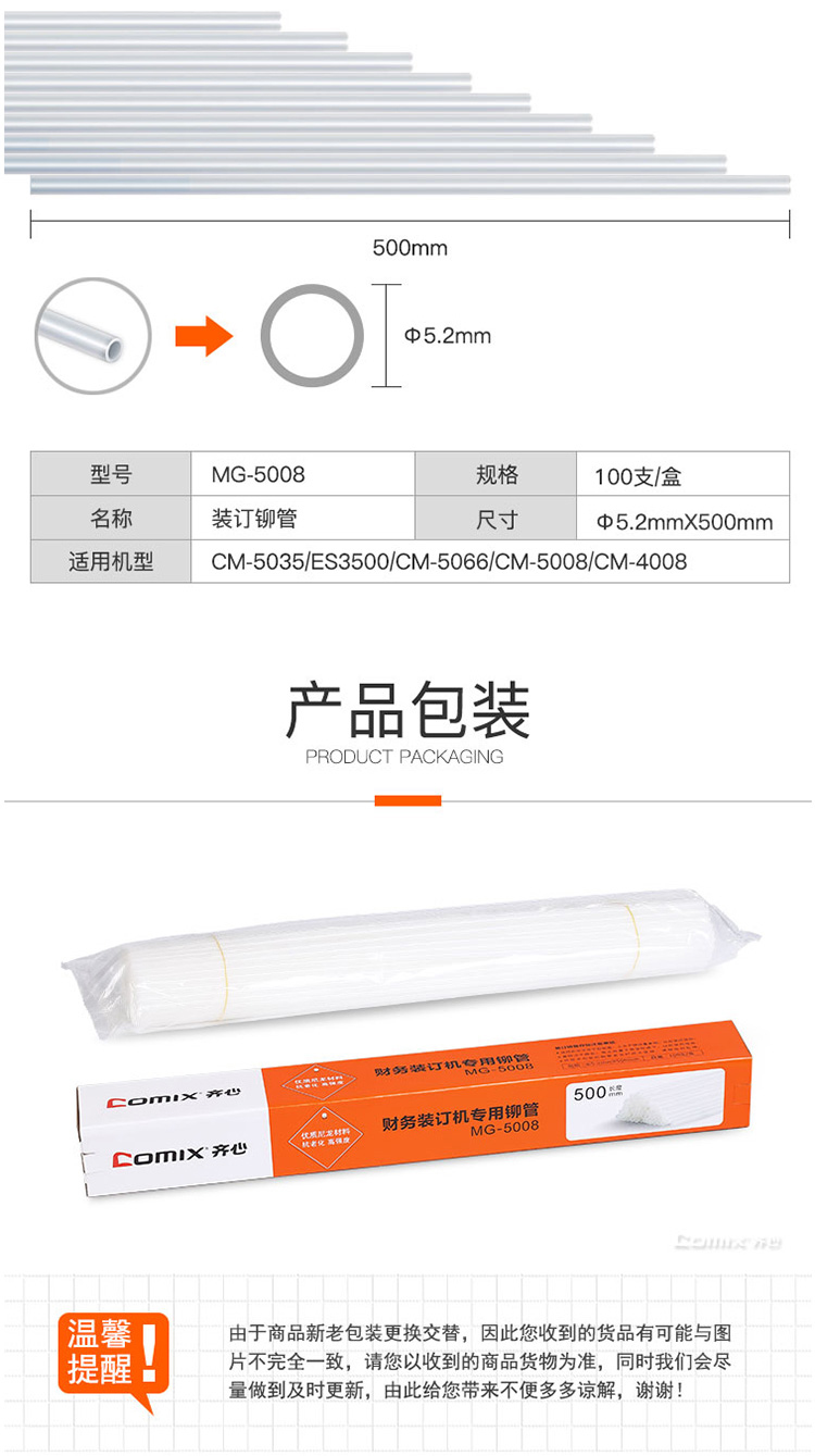 • 商品名称:齐心 MG-5008 财务装订机耗材铆管 白 单位:盒