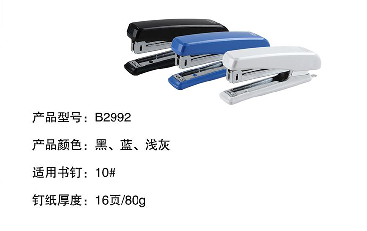 • 商品名称:齐心 B2992 小型强力耐用订书机 10# 16页 配色 单位:个