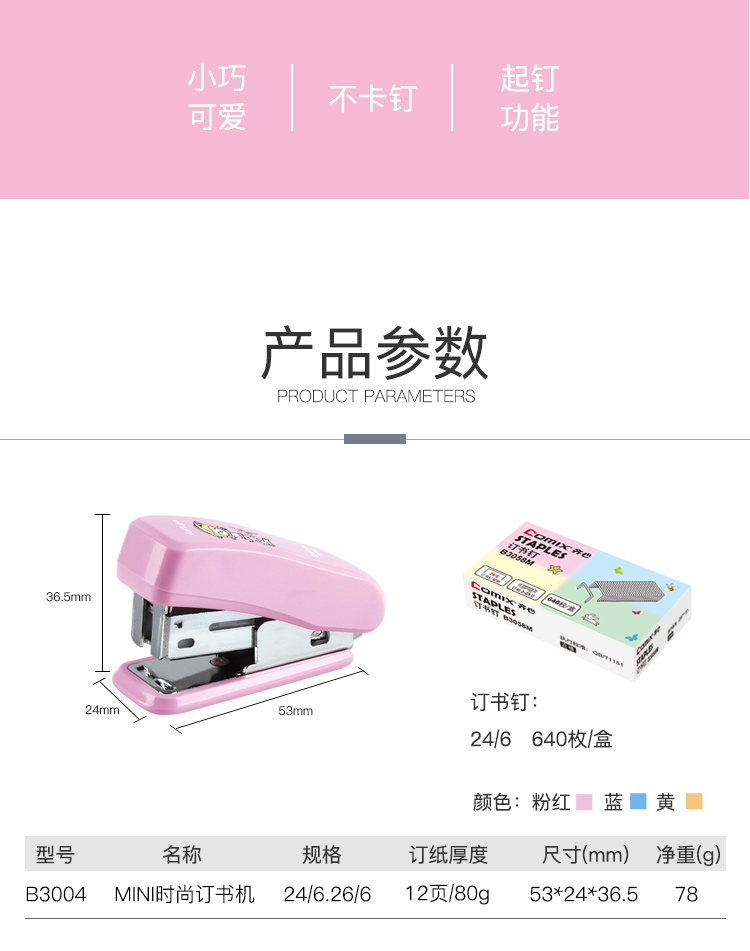 • 商品名称:齐心 B3004 学生订书机套装 12# 25页 配色 单位:套