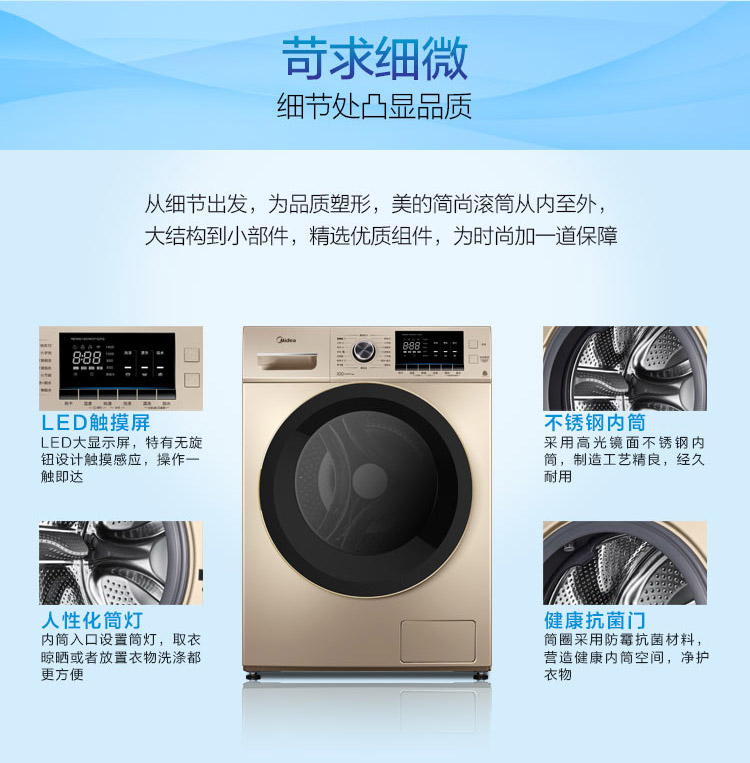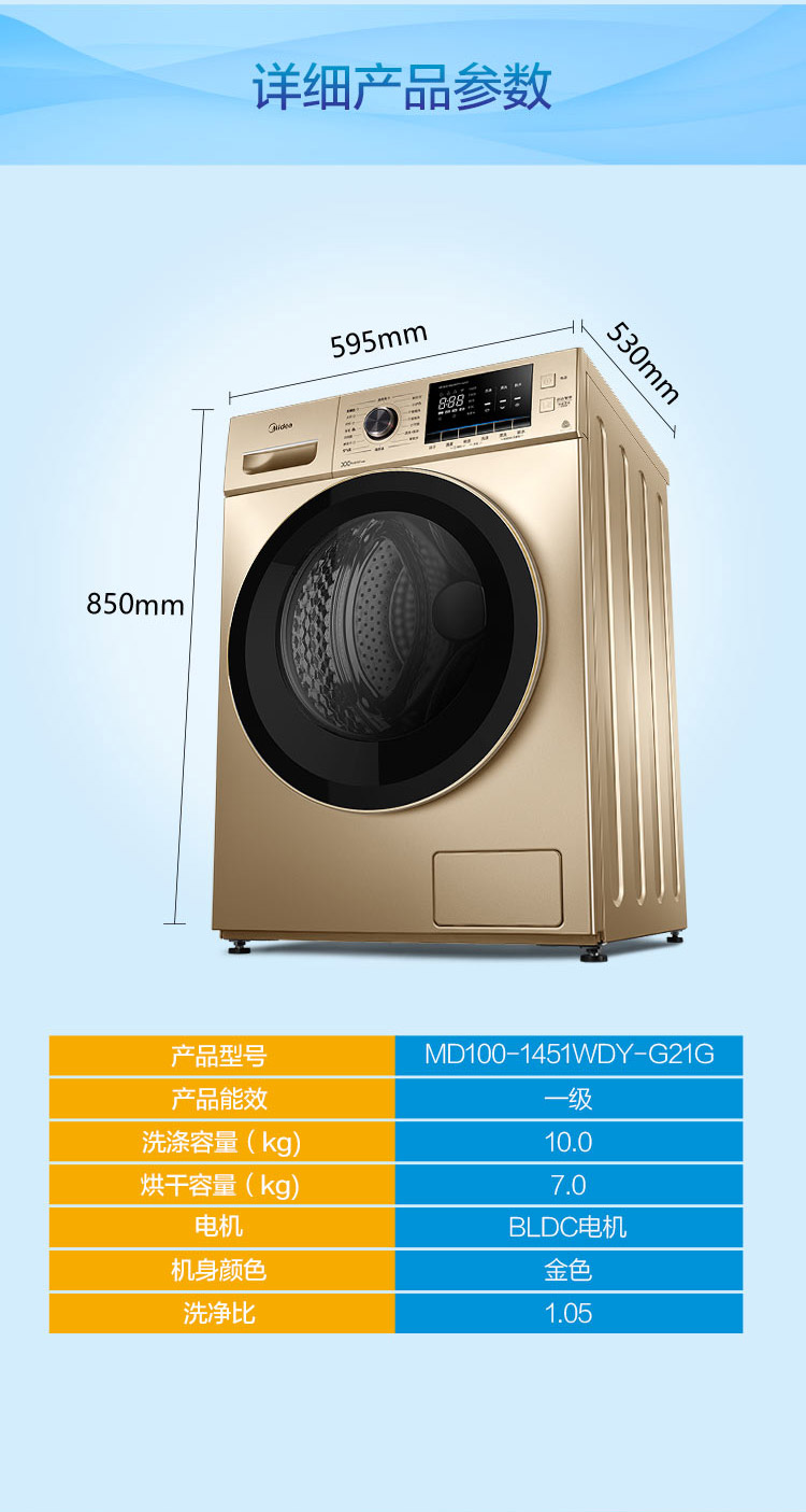 • 商品名称:美的(Midea) MD100-1451WDY-G21G 10公斤变频滚筒全自动洗烘一体机洗衣机 金色(单位:台)