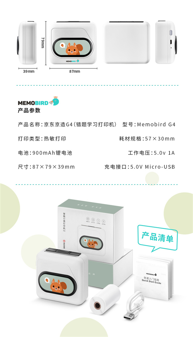 商品名称: 京东京造 G4 高清错题打印机 迷你便携照片热敏打印机 白色(单位:台)