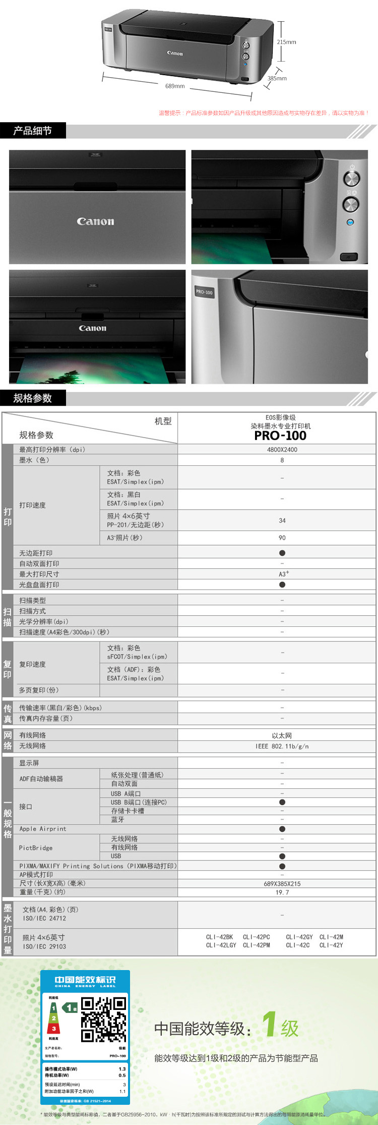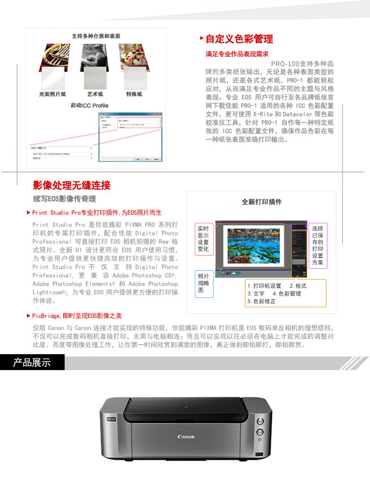 商品名称: 佳能 pro-100 A3幅面EOS影像级染料墨水专业网络打印机