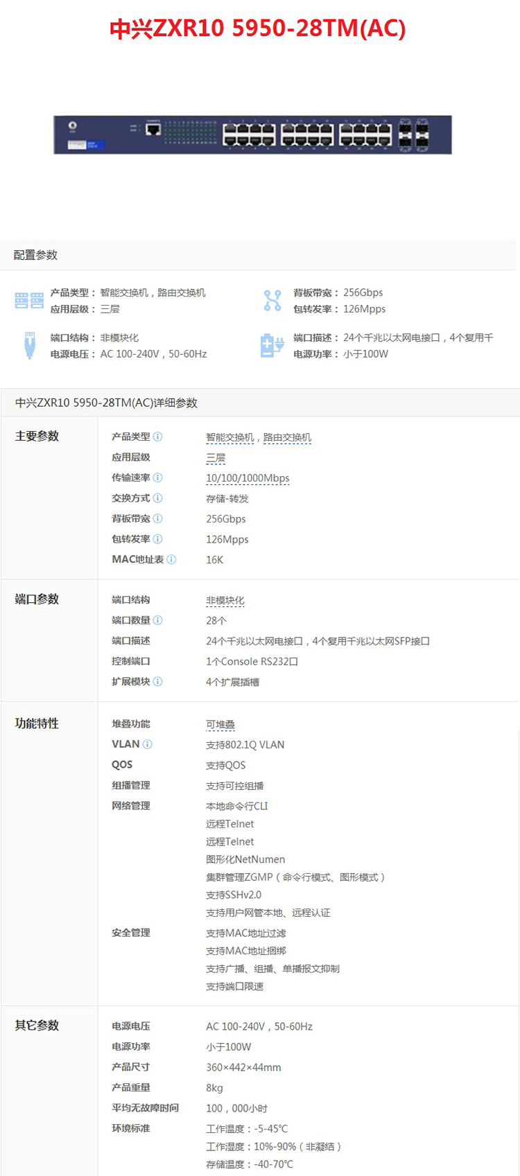 商品名称: 中兴 ZXR10 5950-24TM(AC) 24口千兆交换机 黑色