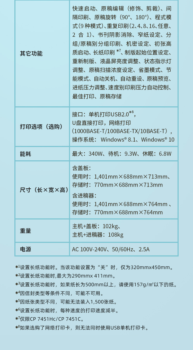 商品名称: 基士得耶 CP 7451C 速印机数码印刷机(主机+盖板+1袋油墨+1卷版纸+工作台+1年保修)单位:台