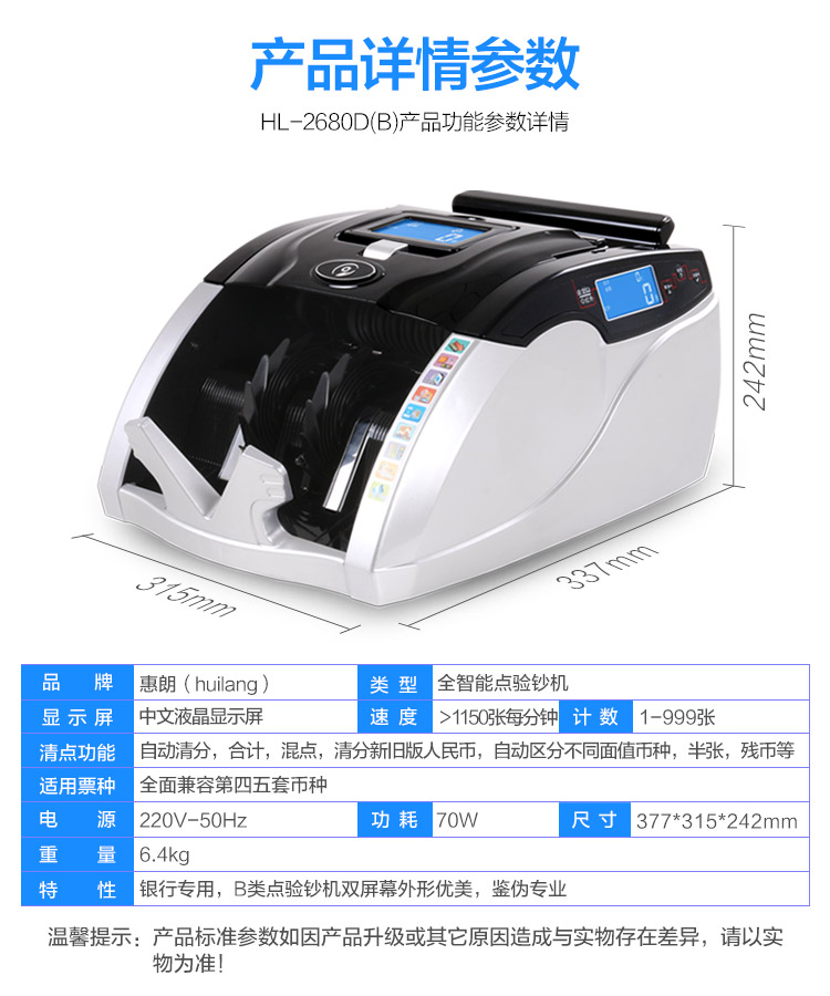 • 商品名称:惠朗 2680D(B) B类智能银行专用点钞机验钞机 黑色 (单位:台)