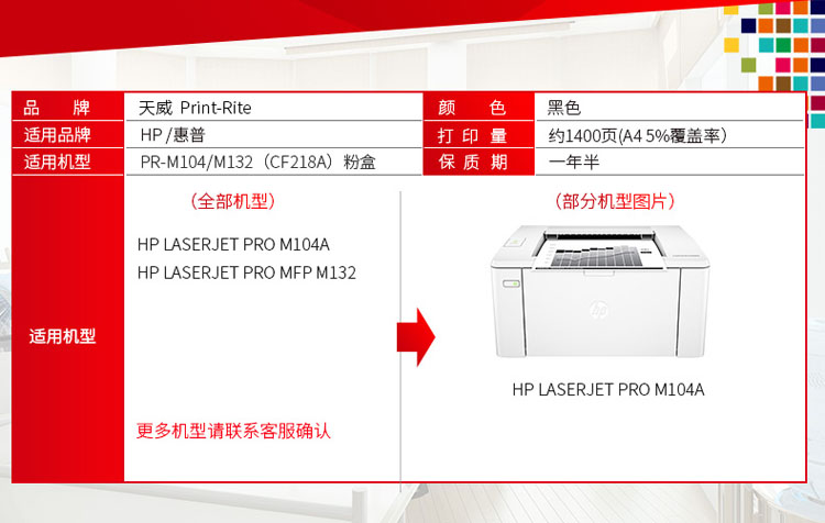 商品名称: 天威 CF218A 蓝包装硒鼓 黑色 (适用惠普M104a MFP M132打印机)
