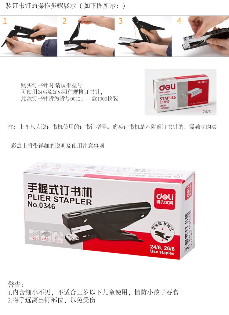 商品名称: 得力 0346 手握式金属耐用订书机 12# 黑色 (单位:个)