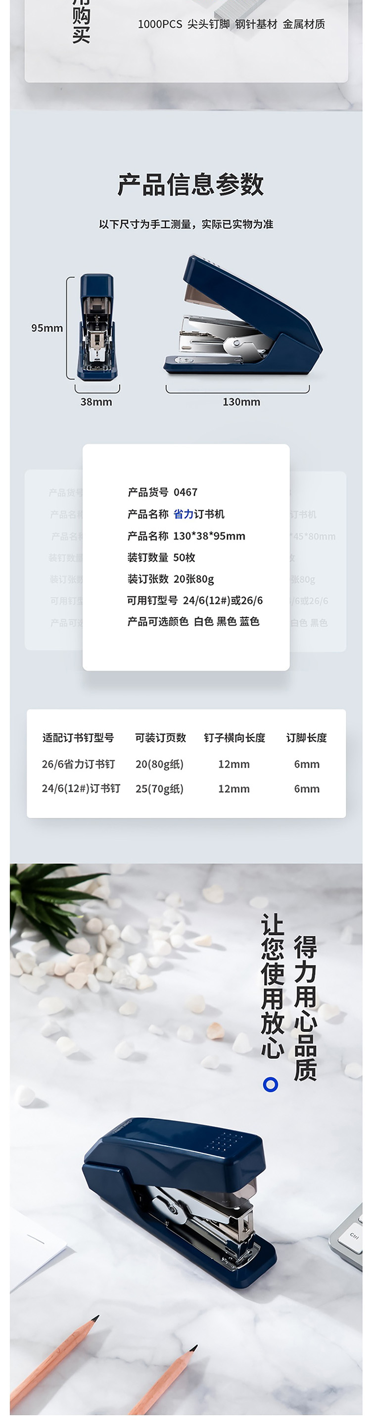 • 商品名称:得力 0467 中号省力结构订书机 12# 蓝色 (单位:个)