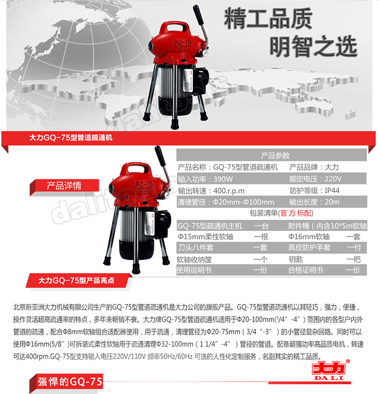 • 商品名称:大力 GQ-75 电动管道疏通清理机 红色(单位:个)