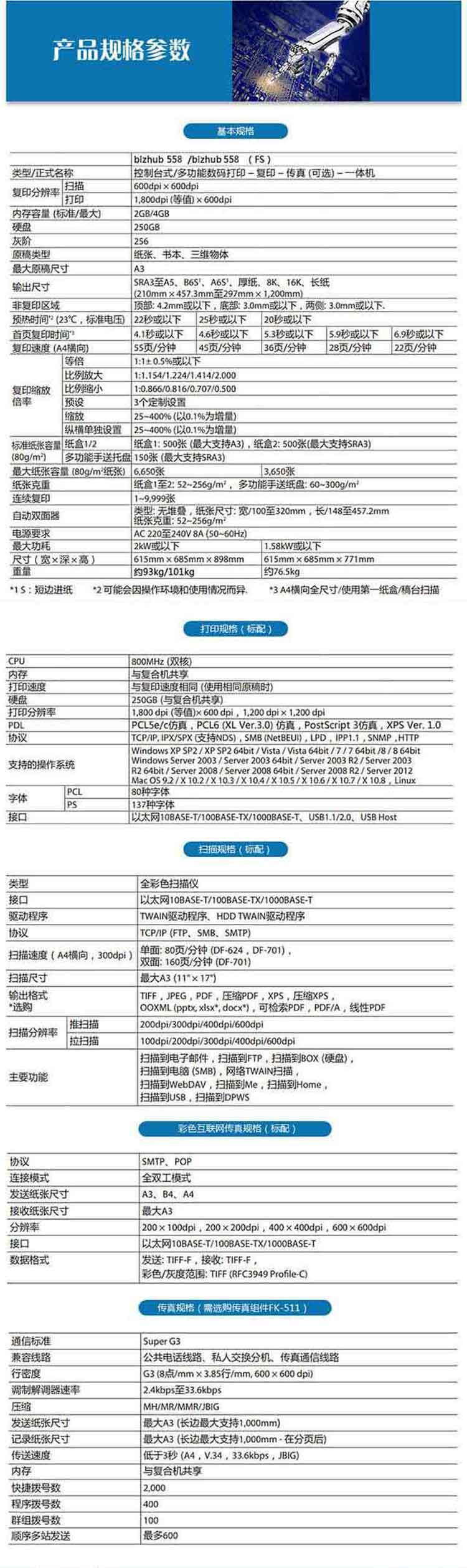 • 商品名称:柯尼卡美能达 bizhub 558 A3数码复合机(双纸盒/双面器/双面送稿器/加配内钉FS-533/PDF编辑软件/工作台/四年维保) (单位:台)