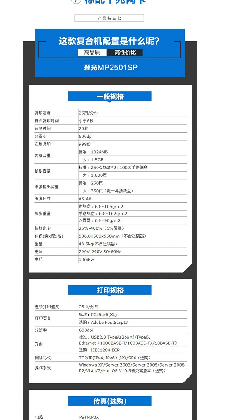 商品名称: 理光MP2501SP黑白数码复合机含输稿器(台)