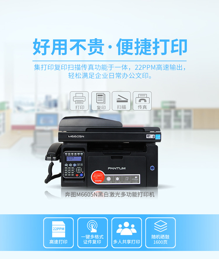 • 商品名称:奔图 M6605N 黑白激光一体机 1200x1200dpi (单位:台) 黑色