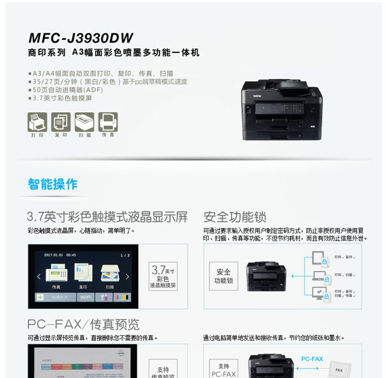 • 商品名称:兄弟 MFC-J3930DW A3幅面 彩色喷墨多功能一体机