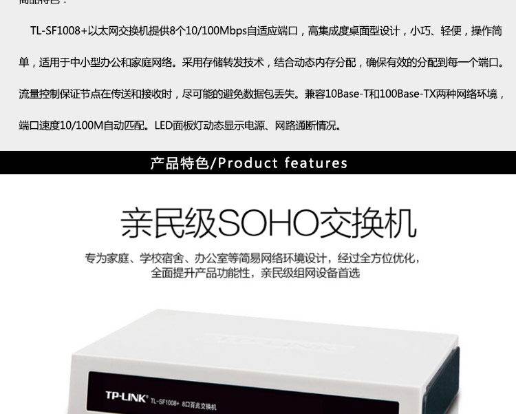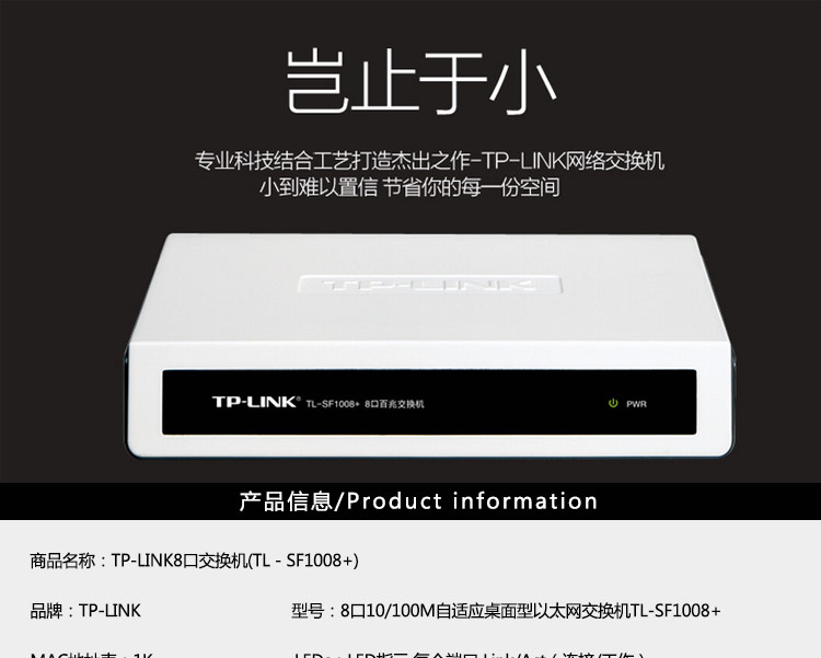 • 商品名称:TP-LINK TL-SF1008 8口百兆VLAN 交换机(单位:台)