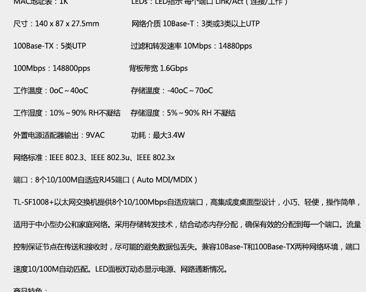 商品名称: TP-LINK TL-SF1008 8口百兆VLAN 交换机(单位:台)