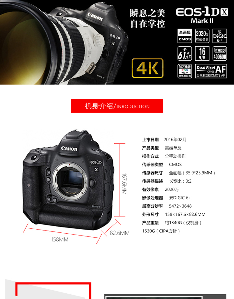 • 商品名称:佳能 EOS-1D X Mark II 数码单反相机套机(EF 16-35mmf/2.8L III USM广角变焦+EF 70-200mm f/2.8L IS II USM 镜头+原装电池+防潮柜)