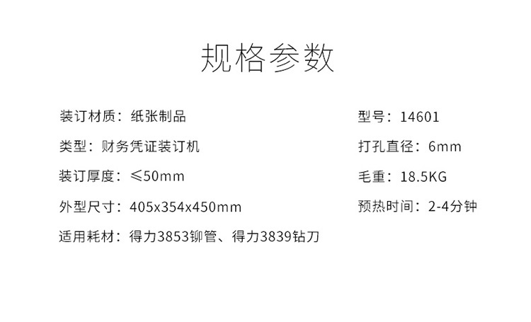 • 商品名称:得力 14601 财务装订机全自动热熔会计档案凭证装订打孔机(单位:台)